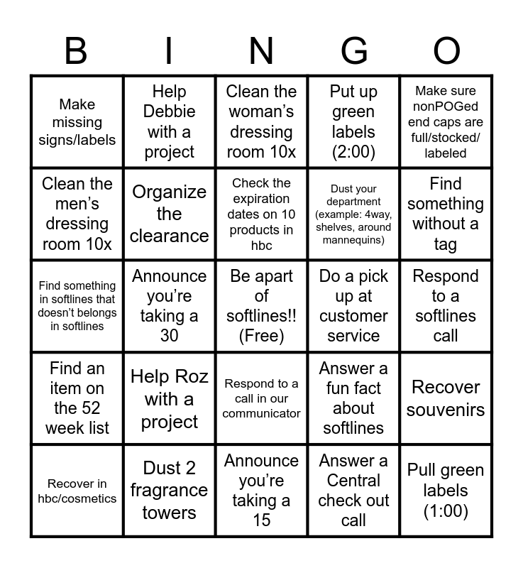 This bingo card has a free space and 24 words: Help Roz with a project, Dust 2 fragrance towers, Check the expiration dates on 10 products in hbc, Recover in hbc/cosmetics, Make sure nonPOGed end caps are full/stocked/ labeled, Make missing signs/labels, Clean the men’s dressing room 10x, Help Debbie with a project, Do a pick up at customer service, Respond to a call in our communicator, Dust your department (example: 4way, shelves, around mannequins), Find something in softlines that doesn’t belongs in softlines, Answer a fun fact about softlines, Recover souvenirs, Organize the clearance, Answer a Central check out call, Respond to a softlines call, Clean the woman’s dressing room 10x, Find something without a tag, Announce you’re taking a 30, Pull green labels (1:00), Find an item on the 52 week list, Put up green labels (2:00) and Announce you’re taking a 15.