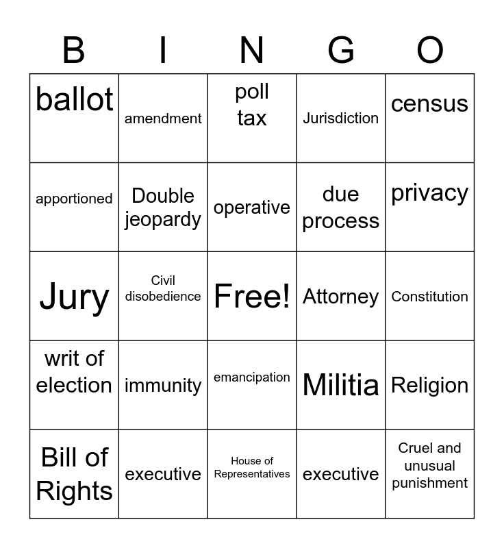 This bingo card has a free space and 24 words: immunity, executive, operative, Bill of Rights, census, ballot, apportioned, amendment, Attorney, emancipation, due process, Jury, Militia, Religion, Double jeopardy, executive, Constitution, poll tax, privacy, Civil disobedience, Cruel and unusual punishment, writ of election, Jurisdiction and House of Representatives.