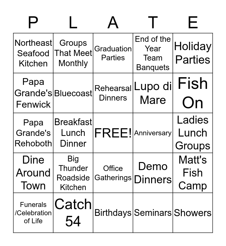 This bingo card has a free space and 24 words: Big Thunder Roadside Kitchen, Catch 54, Rehearsal Dinners, Funerals /Celebration of Life, Holiday Parties, Northeast Seafood Kitchen, Papa Grande's Fenwick, Groups That Meet Monthly, Anniversary, Office Gatherings, Lupo di Mare, Papa Grande's Rehoboth, Demo Dinners, Matt's Fish Camp, Bluecoast, Seminars, Ladies Lunch Groups, Graduation Parties, Fish On, Breakfast Lunch Dinner, Showers, Dine Around Town, End of the Year Team Banquets and Birthdays.