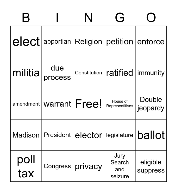 This bingo card has a free space and 24 words: President, Congress, Constitution, poll tax, enforce, elect, militia, apportian, House of Representitives, elector, ratified, amendment, legislature, ballot, due process, Jury Search and seizure, Double jeopardy, Religion, immunity, warrant, eligible suppress, Madison, petition and privacy.