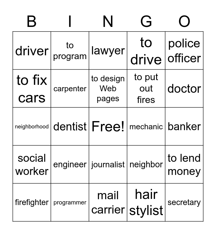 This bingo card has a free space and 29 words: firefighter, nurse, dentist, merchant, driver, lawyer, carpenter, engineer, mechanic, programmer, banker, secretary, mail carrier, hair stylist, doctor, chef, journalist, social worker, police officer, neighborhood, neighbor, to build houses, to put out fires, to fix cars, to drive, to program, to lend money, to design Web pages and to give advice.