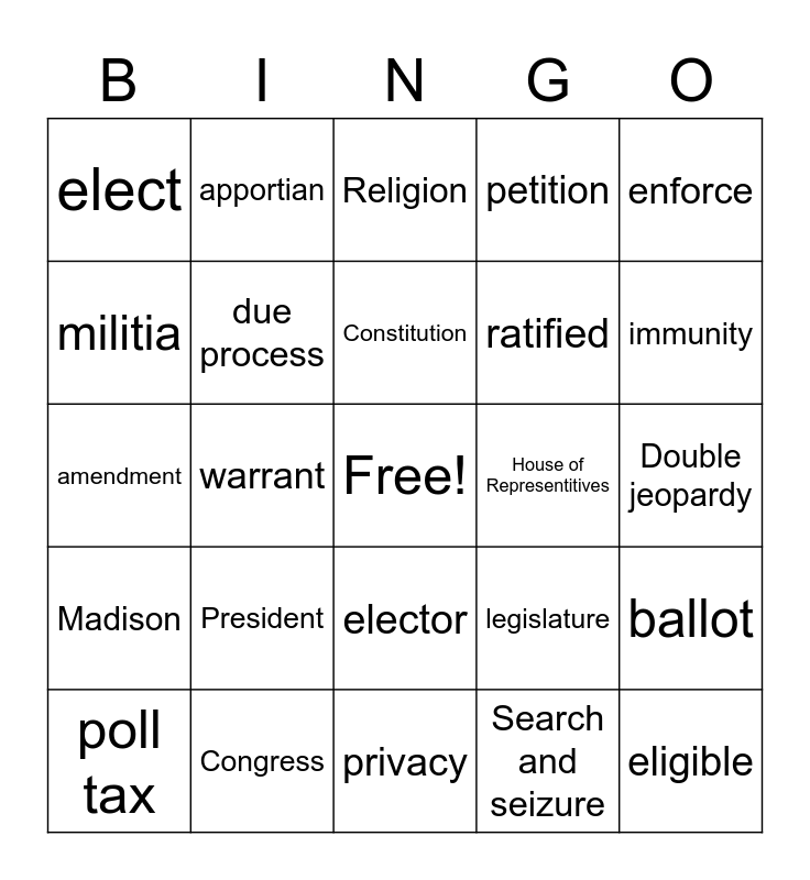 This bingo card has a free space and 24 words: President, Congress, Constitution, poll tax, enforce, elect, militia, apportian, House of Representitives, elector, ratified, amendment, legislature, ballot, due process, Search and seizure, Double jeopardy, Religion, immunity, warrant, eligible, Madison, petition and privacy.