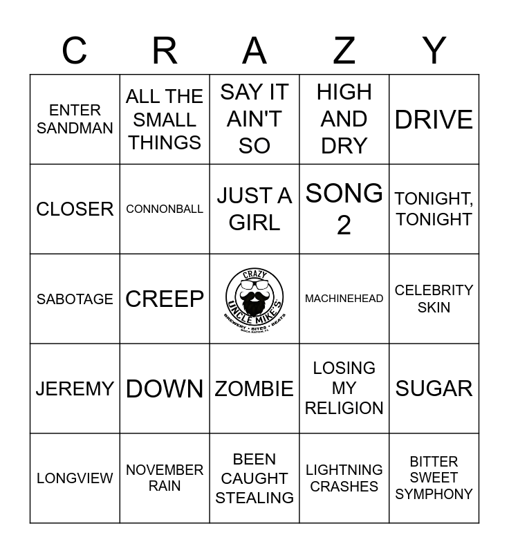 This bingo card has a free space and 54 words: SMELLS LIKE TEEN SPIRIT, JEREMY, KILLING IN THE NAME OF, UNDER THE BRIDGE, ZOMBIE, BLACK HOLE SUN, HIGH AND DRY, 1979, CLOSER, NO EXCUSES, ENTER SANDMAN, WONDERWALL, NOVEMBER RAIN, LONGVIEW, PLUSH, BEEN CAUGHT STEALING, BITTER SWEET SYMPHONY, SONG 2, WHAT I GOT, CELEBRITY SKIN, LOSING MY RELIGION, LOSER, MACHINEHEAD, DRIVE, DON'T SPEAK, ALL THE SMALL THINGS, HARD TO HANDLE, YOU OUGHTA KNOW, DON'T LOOK BACK IN ANGER, LIGHTNING CRASHES, TAKE A PICTURE, KARMA POLICE, COME AS YOU ARE, GIVE IT AWAY, SAY IT AIN'T SO, TODAY, SABOTAGE, SUGAR, BULLS ON PARADE, CONNONBALL, WHEN I COME AROUND, NEARLY LOST YOU, NO RAIN, TOMORROW, DOWN, SHE DON'T USE JELLY, WHAT'S MY AGE AGAIN, FLAGPOLE SITTA, JUST A GIRL, CREEP, TONIGHT, TONIGHT, SELF ESTEEM, BOUND FOR THE FLOOR and PLOWED.