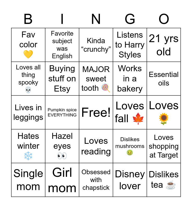 This bingo card has a free space and 24 words: Hazel eyes πŸ‘€, Girl mom, MAJOR sweet tooth 🍭, Single mom, 21 yrs old, Fav color πŸ’›, Loves all thing spooky πŸ’€, Favorite subject was English, Loves fall 🍁, Loves reading, Works in a bakery, Lives in leggings, Dislikes mushrooms 🀒, Loves shopping at Target, Buying stuff on Etsy, Disney lover, Loves🌻, Kinda β€œcrunchy”, Essential oils, Pumpkin spice EVERYTHING, Dislikes tea β˜•οΈ, Hates winter ❄️, Listens to Harry Styles and Obsessed with chapstick.