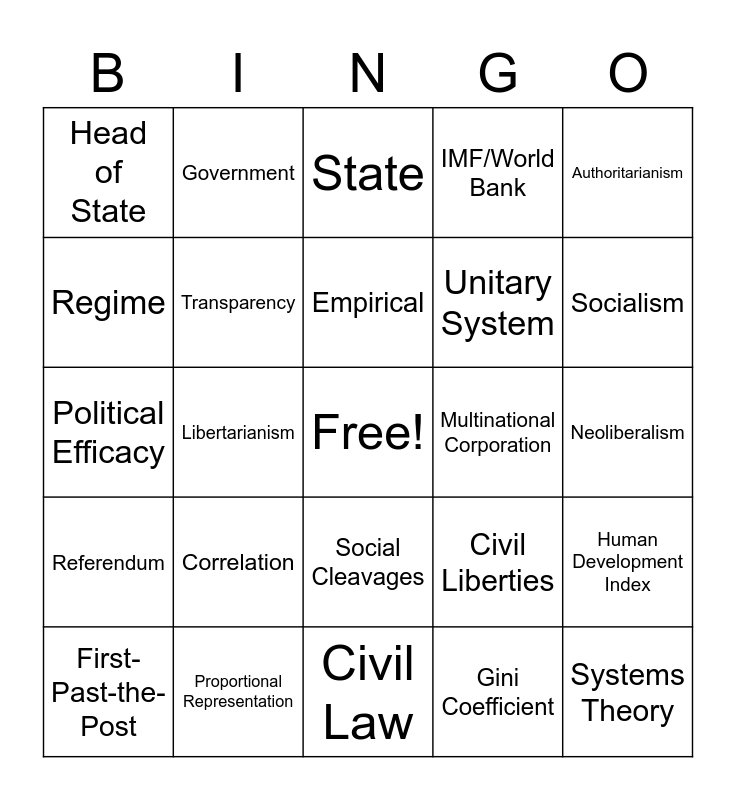This bingo card has a free space and 42 words: Normative, Empirical, Causation, Correlation, Gini Coefficient, Human Development Index, Systems Theory, Nation, State, Social Cleavages, Neoliberalism, Socialism, Libertarianism, Authoritarianism, Civil Society, Civil Liberties, Political Rights, Political Efficacy, Political Legitimacy, Government, Regime, Illiberal Democracy, Democratic Consolidation, Head of State, Head of Government, Federal System, Unitary System, Presidential System, Parliamentary System, Rule of Law, Sovereignty, Referendum, Transparency, Civil Law, Common Law, First-Past-the-Post, Proportional Representation, Multinational Corporation, Economic liberalization, WTO, IMF/World Bank and EU.
