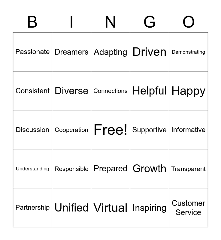 This bingo card has a free space and 75 words: Achieving, Action, Adapting, Admirable, Analysis, Believing, Brainstorming, Caring, Coaching, Collaborative, Communication, Community, Connections, Consistent, Contributing, Cooperation, Coordination, Customer Service, Dedicated, Demonstrating, Developing, Discussion, Diverse, Dreamers, Driven, Educate, Effective, Efficient, Engaging, Fostering, Friendly, Fun, Goals, Growth, Happy, Helpful, Honest, Ideas, Informative, Inspiring, Leadership, Loyal, Mission, Motivating, Networking, Optimistic, Partnership, Passionate, People, Planning, Powerful, Prepared, Prioritize, Productive, Progress, Project, Quality, Reliable, Resourceful, Respectful, Responsible, Solutions, Strategy, Strength, Success, Supportive, Synergy, Teamwork, Transformative, Transparent, Understanding, Unified, Values, Virtual and Vision.