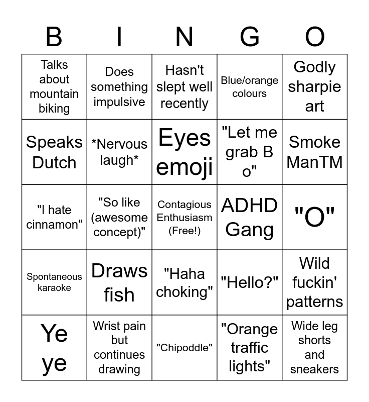 This bingo card has a free space and 24 words: Draws fish, Wrist pain but continues drawing, Eyes emoji, Ye ye, Godly sharpie art, Talks about mountain biking, Speaks Dutch, Does something impulsive, ADHD Gang, "Haha choking", "Let me grab Bo", "I hate cinnamon", "Hello?", Wild fuckin' patterns, *Nervous laugh*, "Orange traffic lights", "O", Hasn't slept well recently, Smoke ManTM, "So like (awesome concept)", Wide leg shorts and sneakers, Spontaneous karaoke, Blue/orange colours and "Chipoddle".