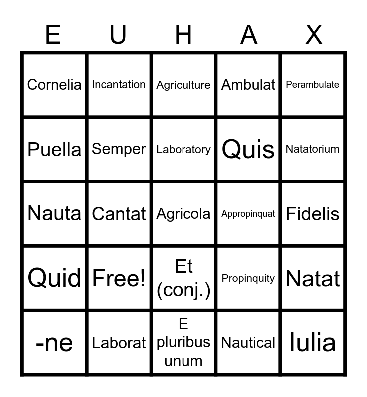 This bingo card has 25 words: Free!, E pluribus unum, Laboratory, -ne, Perambulate, Cornelia, Puella, Incantation, Appropinquat, Et (conj.), Quis, Nauta, Propinquity, Natat, Semper, Iulia, Fidelis, Agriculture, Natatorium, Cantat, Agricola, Laborat, Quid, Ambulat and Nautical.