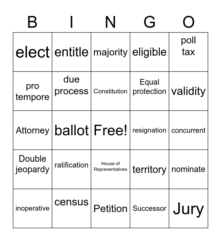This bingo card has a free space and 24 words: ratification, census, Constitution, inoperative, poll tax, elect, pro tempore, entitle, resignation, House of Representatives, Equal protection, Attorney, territory, nominate, due process, Successor, concurrent, majority, validity, ballot, Jury, Double jeopardy, eligible and Petition.