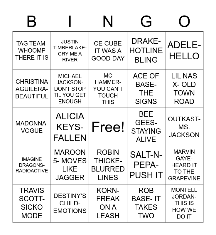 This bingo card has a free space and 63 words: USHER- YEAH, QUEEN- ANOTHER ONE BITES THE DUST, CARLY RAE JEPSEN- CALL ME MAYBE, MARVIN GAYE- HEARD IT TO THE GRAPEVINE, MICHAEL JACKSON- PYT, WHITNEY HOUSTON- I WILL ALWAYS LOVE YOU, JUSTIN TIMBERLAKE- CRY ME A RIVER, MARK RONSON AND BRUNO MARS- UPTOWN FUNK, MC HAMMER- YOU CAN’T TOUCH THIS, LOS DEL RIO- MACERENA, ROBIN THICKE- BLURRED LINES, RIHANNA- WORK, OUTKAST- MS. JACKSON, ADELE- HELLO, LORDE- ROYALS, CHRISTINA AGUILERA- BEAUTIFUL, ALICIA KEYS- FALLEN, TAG TEAM- WHOOMP THERE IT IS, TEVIN CAMPBELL- CAN WE TALK, ACE OF BASE- THE SIGNS, MAROON 5- MOVES LIKE JAGGER, IMAGINE DRAGONS- RADIOACTIVE, DRAKE- HOTLINE BLING, LIONEL RICHIE- HELLO, DIGITAL UNDERGROUND- HUMPTY DANCE, KATY PERRY- DARK HORSE, THE EAGLES- HOTEL CALIFORNIA, PHIL COLLINS- IN THE AIR TONIGHT, BON JOVI- LIVING ON A PRAYER, MISSY- THE RAIN, BILLY RAY CYRUS- ACHY BREAKY HEART, PRINCE- WHEN DOVES CRY, BRUNO MARS- 24K MAGIC, MICHAEL MCDONALD- I KEEP FORGETTING, LIL NAS X- OLD TOWN ROAD, TRAVIS SCOTT- SICKO MODE, THE WEEKND- EARNED IT, ROB BASE- IT TAKES TWO, LADY GAGA- POKER FACE, MICHAEL JACKSON- DON'T STOP TIL YOU GET ENOUGH, MADONNA- VOGUE, BEE GEES- STAYING ALIVE, WILL SMITH- SUMMERTIME, BEYONCE- SINGLE LADIES, MONTELL JORDAN- THIS IS HOW WE DO IT, DESTINY’S CHILD- EMOTIONS, DIXIE CHICKS- NOT READY TO MAKE NICE, SALT-N-PEPA- PUSH IT, BLACKSTREET- NO DIGGITY, SUGAR HILL GANG- RAPPERS DELIGHT, BIZ MARKIE- JUST A FRIEND, KORN- FREAK ON A LEASH, NIRVANA- SMELLS LIKE TEEN SPIRIT, GUNS N ROSES- WELCOME TO THE JUNGLE, BEYONCE FEAT JAY Z- CRAZY IN LOVE, ICE CUBE- IT WAS A GOOD DAY, PUFF DADDY & THE FAMILY- IT’S ALL ABOUT THE BENJAMINS, MARK MORRISON- RETURN OF THE MACK, EARTH WIND AND FIRE- SEPTEMBER, VANILLA ICE- ICE ICE BABY, THE BACKSTREET BOYS- EVERYBODY, 'NSYNC- GONE and STEVIE WONDER- SUPERSTITION.