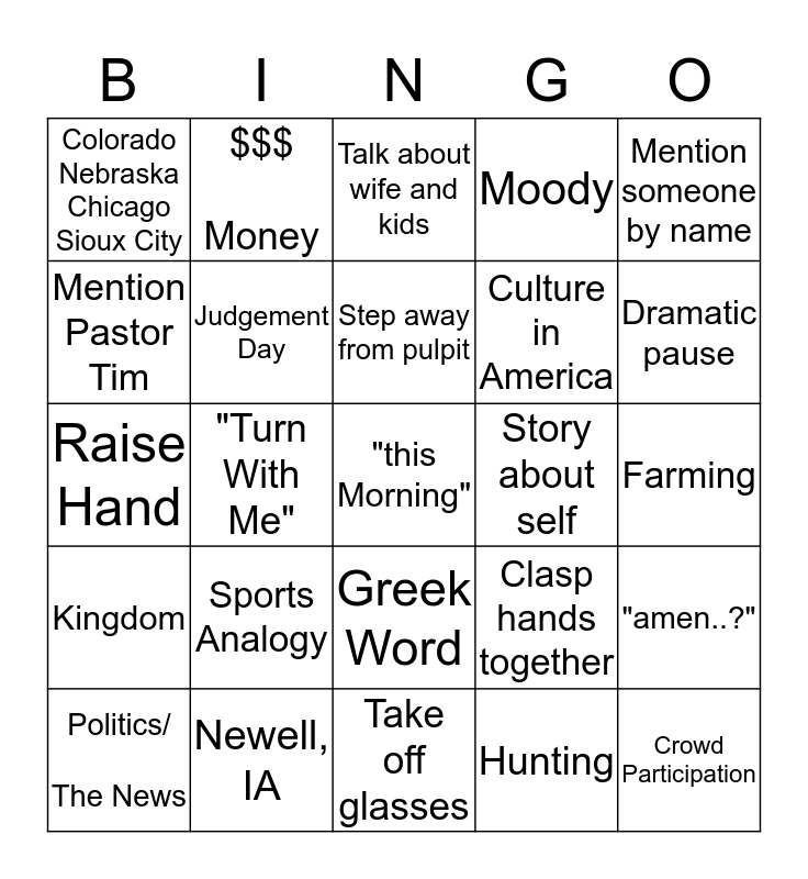 This bingo card has a free space and 24 words: Sports Analogy, Newell, IA, Step away from pulpit, Politics/ The News, Mention someone by name, Colorado Nebraska Chicago Sioux City, Mention Pastor Tim, $$$ Money, Story about self, Greek Word, Culture in America, Raise Hand, Clasp hands together, "amen..?", Judgement Day, Hunting, Farming, Talk about wife and kids, Dramatic pause, "Turn With Me", Crowd Participation, Kingdom, Moody and Take off glasses.