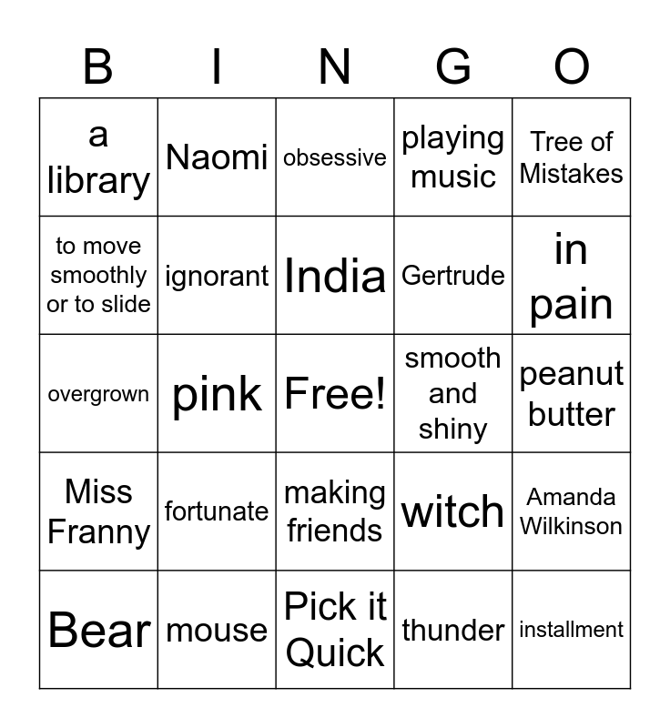 This bingo card has a free space and 24 words: fortunate, mouse, India, Bear, Tree of Mistakes, a library, to move smoothly or to slide, Naomi, smooth and shiny, making friends, Gertrude, overgrown, witch, Amanda Wilkinson, ignorant, thunder, peanut butter, obsessive, in pain, pink, installment, Miss Franny, playing music and Pick it Quick.