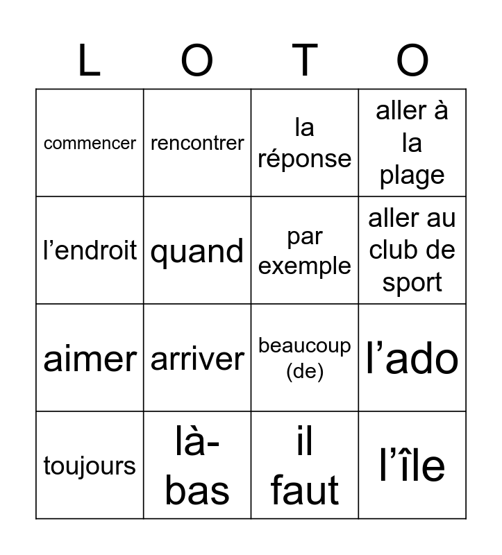 This bingo card has 19 words: beaucoup (de), le mois, la réponse, l’île, l’ado, l’endroit, il faut, commencer, rencontrer, aimer, arriver, quand, par exemple, là-bas, toujours, puis, aller à la plage, aller au club de sport and qu’est-ce que.