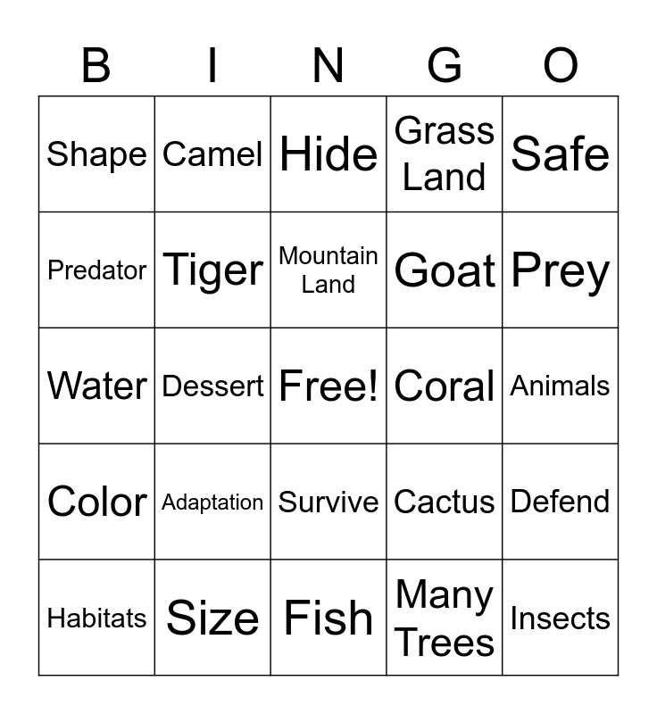 This bingo card has a free space and 24 words: Habitats, Adaptation, Mountain Land, Many Trees, Safe, Shape, Camel, Hide, Coral, Animals, Water, Tiger, Cactus, Defend, Predator, Size, Fish, Grass Land, Prey, Color, Dessert, Survive, Goat and Insects.