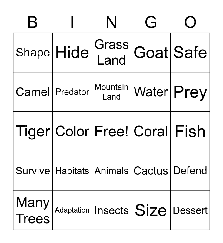 This bingo card has a free space and 24 words: Habitats, Adaptation, Mountain Land, Many Trees, Safe, Shape, Camel, Hide, Coral, Animals, Water, Tiger, Cactus, Defend, Predator, Size, Fish, Grass Land, Prey, Color, Dessert, Survive, Goat and Insects.