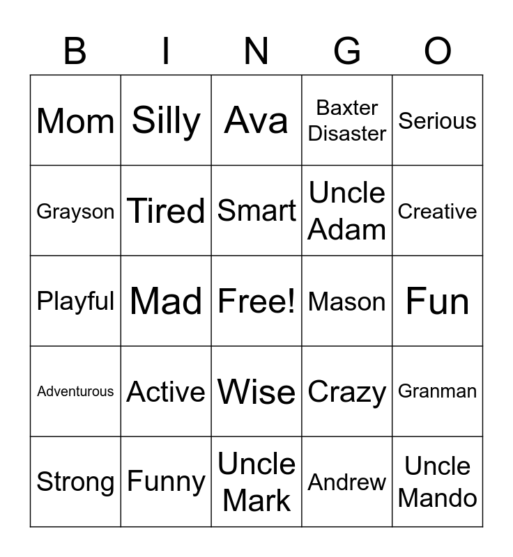This bingo card has a free space and 24 words: Active, Funny, Smart, Strong, Serious, Mom, Grayson, Silly, Mason, Wise, Uncle Adam, Playful, Crazy, Granman, Tired, Andrew, Fun, Ava, Creative, Mad, Uncle Mando, Adventurous, Baxter Disaster and Uncle Mark.
