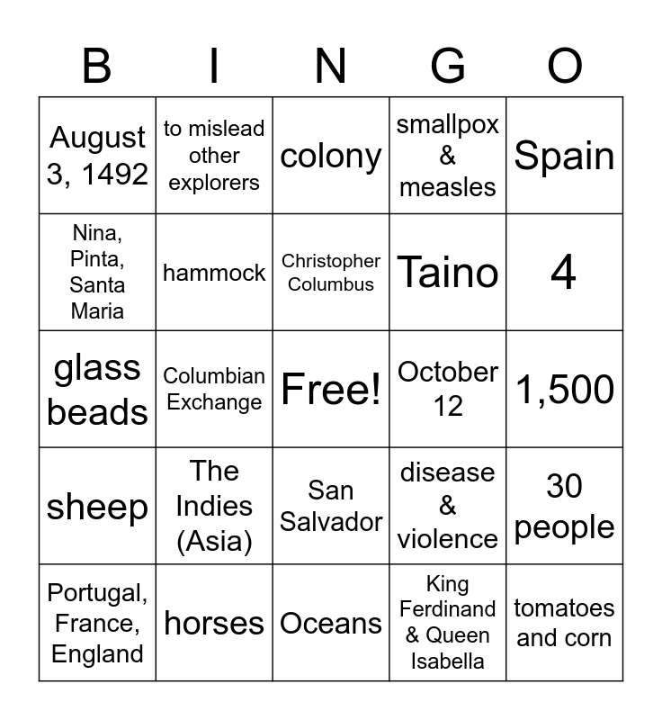 This bingo card has a free space and 25 words: The Indies (Asia), Oceans, Christopher Columbus, Portugal, France, England, Spain, August 3, 1492, Nina, Pinta, Santa Maria, to mislead other explorers, October 12, San Salvador, Taino, glass beads, disease & violence, 30 people, hammock, Claim more land, 1,500, colony, 4, Columbian Exchange, tomatoes and corn, horses, sheep, smallpox & measles and King Ferdinand & Queen Isabella.