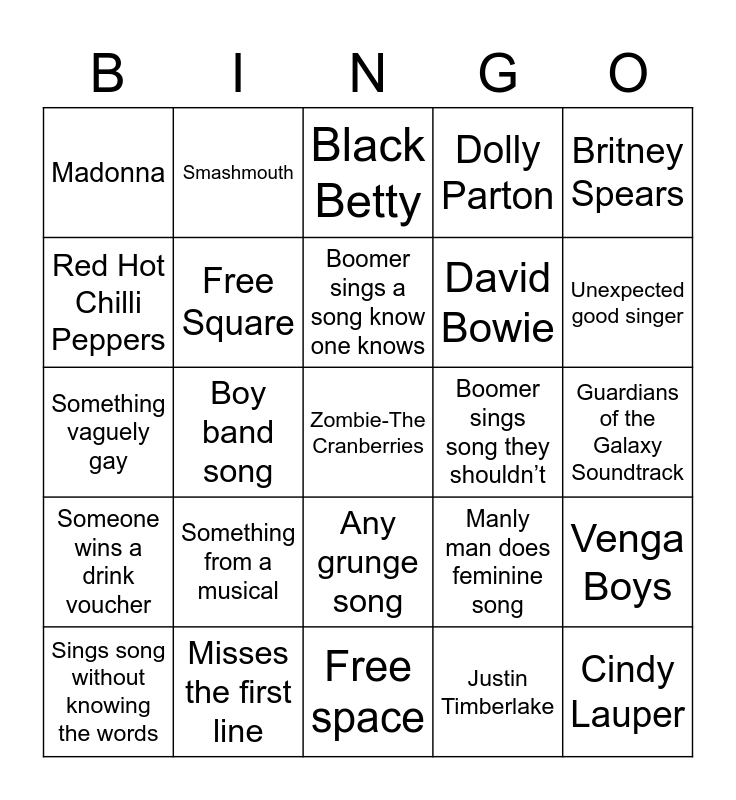 This bingo card has 48 words: Something from a musical, Zombie-The Cranberries, Smashmouth, Free space, Something from a musical, Zombie The Cranberries, Smashmouth, Any rap song, Red Hot Chilli Peppers, Tribute Tenacious D, Free Square, Dolly Parton, Venga Boys, Manly man does feminine song, Queen, ABBA, Boomer sings a song know one knows, Boomer sings song they shouldn’t, My Humps, Britney Spears, Boy band song, Justin Timberlake, Madonna, David Bowie, White person sings something black, Unexpected good singer, Sings song without knowing the words, Torn, Any grunge song, Someone wins a drink voucher, My Sharona, Take On Me, Someone dances on stage, Stepping of the stage, Misses the first line, Happy birthday, Sounds like the real thing, Guardians of the Galaxy Soundtrack, Bon Jovi, AC/DC, Aussie rock, Cindy Lauper, Black Betty, Cops show up, Something vaguely gay, The Voice, Movie song and Creep.