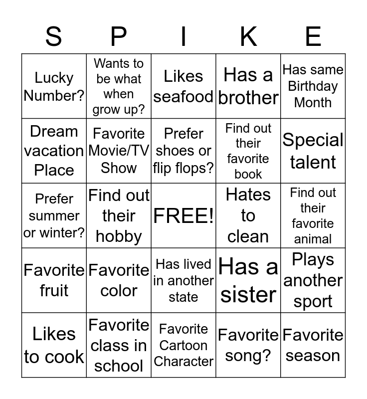 This bingo card has a free space and 24 words: Favorite color, Favorite class in school, Prefer shoes or flip flops?, Likes to cook, Has same Birthday Month, Lucky Number?, Dream vacation Place, Wants to be what when grow up?, Hates to clean, Has lived in another state, Find out their favorite book, Prefer summer or winter?, Has a sister, Plays another sport, Favorite Movie/TV Show, Favorite song?, Find out their favorite animal, Likes seafood, Special talent, Find out their hobby, Favorite season, Favorite fruit, Has a brother and Favorite Cartoon Character.