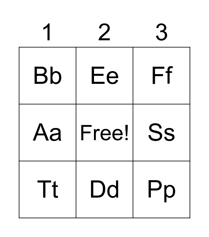 This bingo card has a free space and 8 words: Aa, Ee, Ss, Tt, Ff, Bb, Dd and Pp.