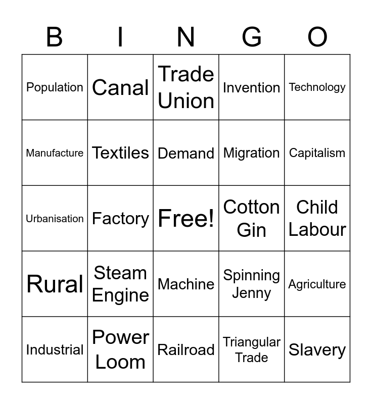 This bingo card has a free space and 29 words: Industrial, Revolution, Factory, Worker, Population, Trade Union, Textiles, Steam Engine, Cotton Gin, Power Loom, Child Labour, Slavery, Railroad, Triangular Trade, Capitalism, Communism, Machine, Rural, Technology, Urbanisation, Spinning Jenny, Production, Migration, Manufacture, Invention, Canal, Agriculture, Demand and Supply.