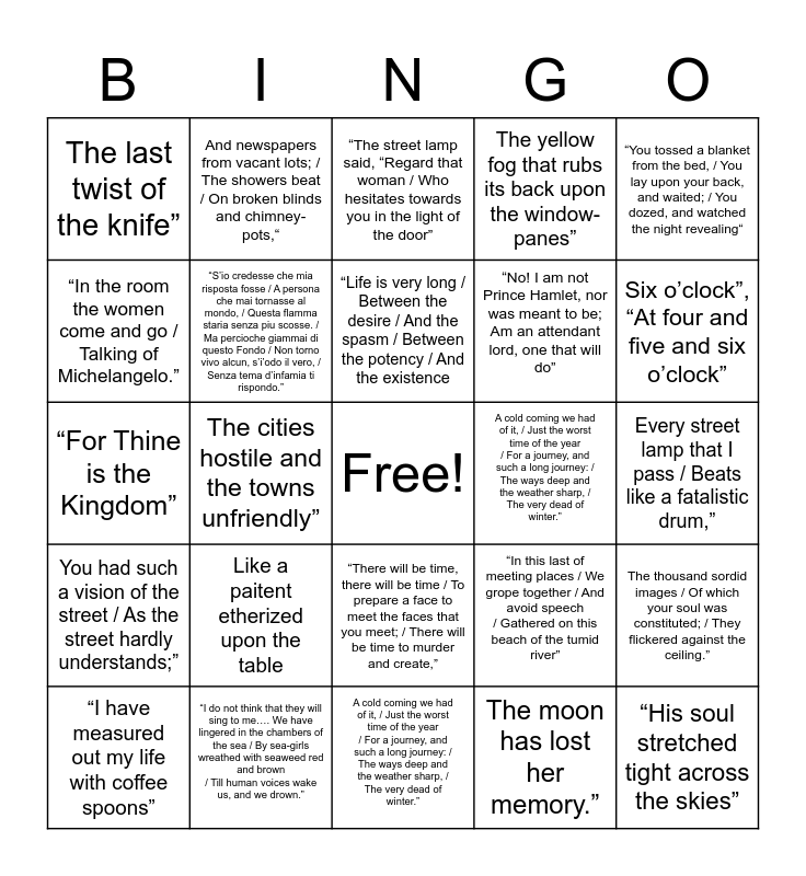 This bingo card has a free space and 26 words: “There will be time, there will be time / To prepare a face to meet the faces that you meet; / There will be time to murder and create,”, The moon has lost her memory.”, “Life is very long / Between the desire / And the spasm / Between the potency / And the existence, “I do not think that they will sing to me…. We have lingered in the chambers of the sea / By sea-girls wreathed with seaweed red and brown / Till human voices wake us, and we drown.”, “You tossed a blanket from the bed, / You lay upon your back, and waited; / You dozed, and watched the night revealing“, The last twist of the knife”, “In the room the women come and go / Talking of Michelangelo.”, And newspapers from vacant lots; / The showers beat / On broken blinds and chimney-pots,“, Every street lamp that I pass / Beats like a fatalistic drum,”, “In this last of meeting places / We grope together / And avoid speech / Gathered on this beach of the tumid river”, “No! I am not Prince Hamlet, nor was meant to be; Am an attendant lord, one that will do”, “For Thine is the Kingdom”, The thousand sordid images / Of which your soul was constituted; / They flickered against the ceiling.”, “I have measured out my life with coffee spoons”, The cities hostile and the towns unfriendly”, The burnt-out ends of smoky days”, The yellow fog that rubs its back upon the window-panes”, You had such a vision of the street / As the street hardly understands;”, “The street lamp said, “Regard that woman / Who hesitates towards you in the light of the door”, “His soul stretched tight across the skies”, Six o’clock”, “At four and five and six o’clock”, A cold coming we had of it, / Just the worst time of the year / For a journey, and such a long journey: / The ways deep and the weather sharp, / The very dead of winter.”, A cold coming we had of it, / Just the worst time of the year / For a journey, and such a long journey: / The ways deep and the weather sharp, / The very dead of winter.”, Like a paitent etherized upon the table, “S’io credesse che mia risposta fosse / A persona che mai tornasse al mondo, / Questa flamma staria senza piu scosse. / Ma percioche giammai di questo Fondo / Non torno vivo alcun, s’i’odo il vero, / Senza tema d’infamia ti rispondo.” and A cold coming we had of it, / Just the worst time of the year / For a journey, and such a long journey: / The ways deep and the weather sharp, / The very dead of winter.”.