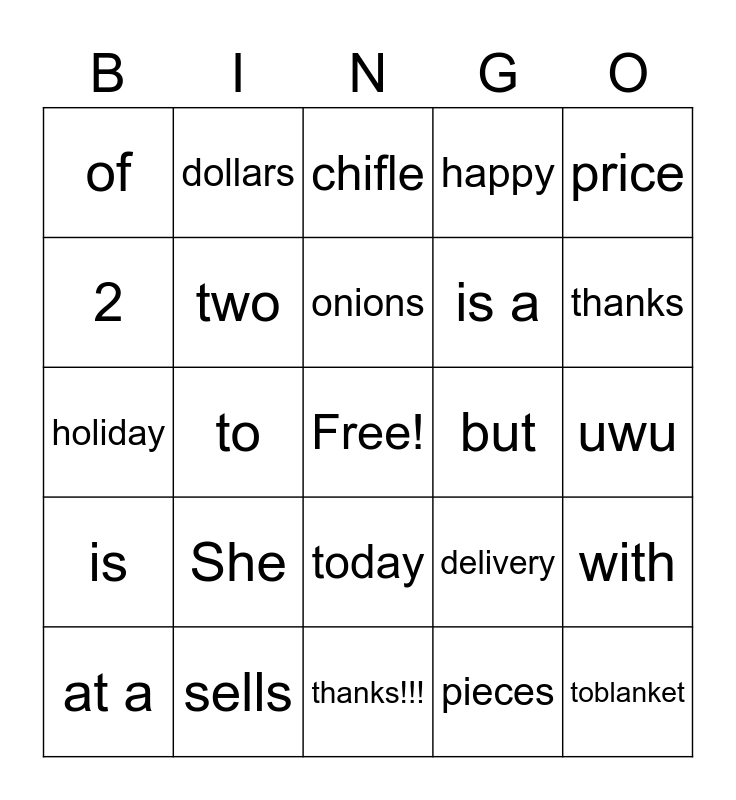 This bingo card has a free space and 24 words: She, sells, onions, at a, price, of, 2, dollars, but, today, is a, holiday, delivery, with, two, pieces, uwu, chifle, thanks, to, toblanket, is, happy and thanks!!!.