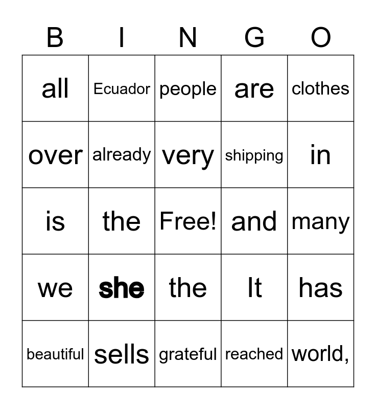 This bingo card has a free space and 24 words: she, sells, very, beautiful, clothes, all, over, Ecuador, and, the, shipping, is, It, has, already, reached, many, people, in, the, world,, we, are and grateful.