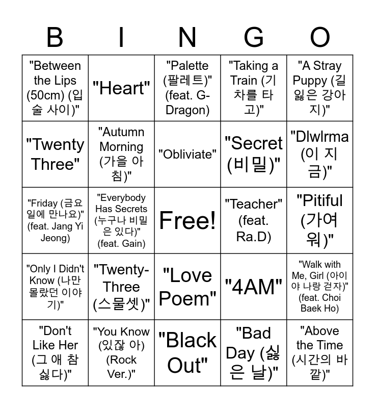 This bingo card has a free space and 100 words: "Looking At You (바라보기)", "Boo", "Pitiful (가여워)", "A Dreamer", "Every Sweet Day", "Lost Child (미아)", "Four Without Me (나 말고 넷)", "You Know (있잖 아)" (Feat. Mario), "Graduation Day (졸업하는 날)", "Feel So Good", "Ugly Duckling (미운 오리)", "Face to Face (After Looking At You) (마주보기 (바라보기 그 후))", "Lost Child (미아) (Acoustic Ver.)", "You Know (있잖 아) (Rock Ver.)", "Boo (Inst.)", "Pitiful (가여워), "Secret (비밀)", "Sleeping Prince of the Woods (잠자는 숲속의 왕자 )" (feat. Yoon Sang), "A Child Searching for Stars (별을 찾는 아이)" (feat. Kim Kwang Jin), "You and I (너랑 나)", "Wallpaper Pattern (벽지무늬)", "Uncle (삼촌)" (feat. Lee Juck), "Wisdom Tooth (사랑니)", "Everything's Alright" (feat. Kim Hyeon Cheol), "Last Fantasy, "Teacher" (feat. Ra.D), "A Stray Puppy (길잃은 강아지)", "4AM", "L'amant (라망)", "Love of B (을의 연애)" (with Park Ju Won), "Everybody Has Secrets (누구나 비밀은 있다)" (feat. Gain), "Between the Lips (50cm) (입술 사이)", "The Red Shoes (분홍신)", "Modern Times", "Bad Day (싫은 날)", "Obliviate", "Walk with Me, Girl (아이야 나랑 걷자)" (feat. Choi Baek Ho), "Havana", "A Gloomy Clock (우울시계)" (feat. Jong Hyun), "Daydream (한낮의 꿈)" (feat. Yang Hee Eun), "Wait (기다려)", "Voice Mai, "Friday (금요일에 만나요)" (feat. Jang Yi Jeong), "Pastel Crayon (크레파스), "Dlwlrma (이 지금)", "Palette (팔레트)" (feat. G-Dragon), "Ending Scene (이런 엔딩)", "Can't Love You Anymore (사랑이 잘)" (with Oh Hyuk), "Jam Jam (잼잼)", "Black Out", "Full Stop (마침표)", "Through the Night (밤편지)", "Love Alone (그렇게 사랑은)", "Dear Name (이름에게)", "Ugly Duckling (미운 오리)", "Lost Child (미아)", "Feel So Good", "Every Sweet Day", "Love Attack", "Taking a Train (기차를 타고)", "Marshmallow (마쉬멜로우)", "Tear Drops in the Morning (아침 눈물)", "Heart Beating Date (두근 두근 데이트)", "Not Like This (이게 아닌데)", "What I'm Doing Slow (느리게 하는 일)", "Good Day (좋은 날)", "The Night of the First Breakup (첫 이별 그날 밤)", "In A Room Alone (혼자 있는 방)", "Merry Christmas Ahead (미리 메리 크리스마스), "Shoes (새 신발)", "Zezé", "Twenty-Three (스물셋)", "The Shower (푸르던)", "Red Queen" (feat. Zion.T), "Knees (무릎)", "Glasses (안경)", "Heart (마음)", "Twenty Three", "Unlucky", "The Visitor (그 사람)", "Blueming", "Above the Time (시간의 바깥)", "Lullaby (자장가)", "Love Poem", "Nagging", "Heart", "Bbibbi", "Eight", "Rain Drop", "Only I Didn't Know (나만 몰랐던 이야기)", "Cruel Fairytale (잔혹동화)", "Peach (복숭아)", "Every End of the Day (하루 끝)", "Don't Like Her (그 애 참 싫다)", "Autumn Morning (가을 아침)", "Secret Garden (비밀의 화원)", "Sleepless Rainy Night (잠 못 드는 밤 비는 내리고)", "Last Night Story (어젯밤 이야기)", "By the Stream (개여울)" and "Everyday with You (매일 그대와)".