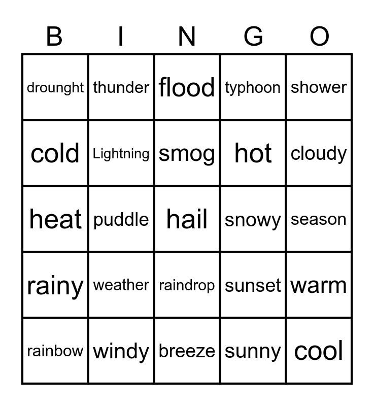 This bingo card has a free space and 30 words: windy, chilly, puddle, warm, drounght, flood, Lightning, raindrop, snowy, breeze, season, cool, sunny, temperature, cloudy, storm, sunset, rainy, weather, shower, heat, sunshine, thunder, hot, cold, typhoon, warm, rainbow, smog and windy,blizzard, flood, forecast,.