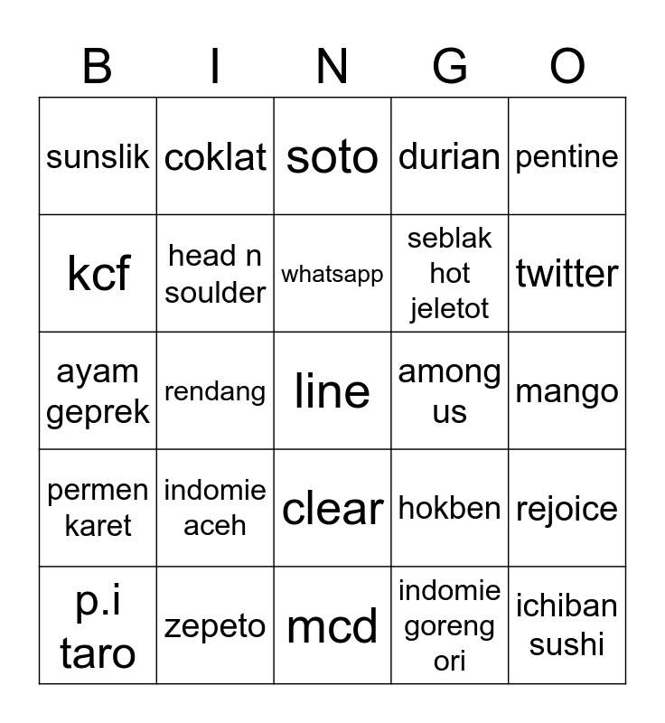 This bingo card has a free space and 24 words: p.i taro, indomie aceh, whatsapp, indomie goreng ori, pentine, sunslik, coklat, soto, among us, mango, ayam geprek, head n soulder, hokben, rejoice, kcf, zepeto, mcd, durian, twitter, permen karet, rendang, clear, seblak hot jeletot and ichiban sushi.