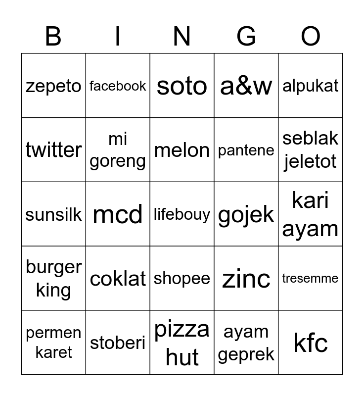 This bingo card has a free space and 24 words: coklat, stoberi, melon, permen karet, alpukat, zepeto, twitter, facebook, gojek, shopee, pantene, sunsilk, zinc, tresemme, mi goreng, ayam geprek, kari ayam, soto, seblak jeletot, mcd, kfc, burger king, a&w and pizza hut.