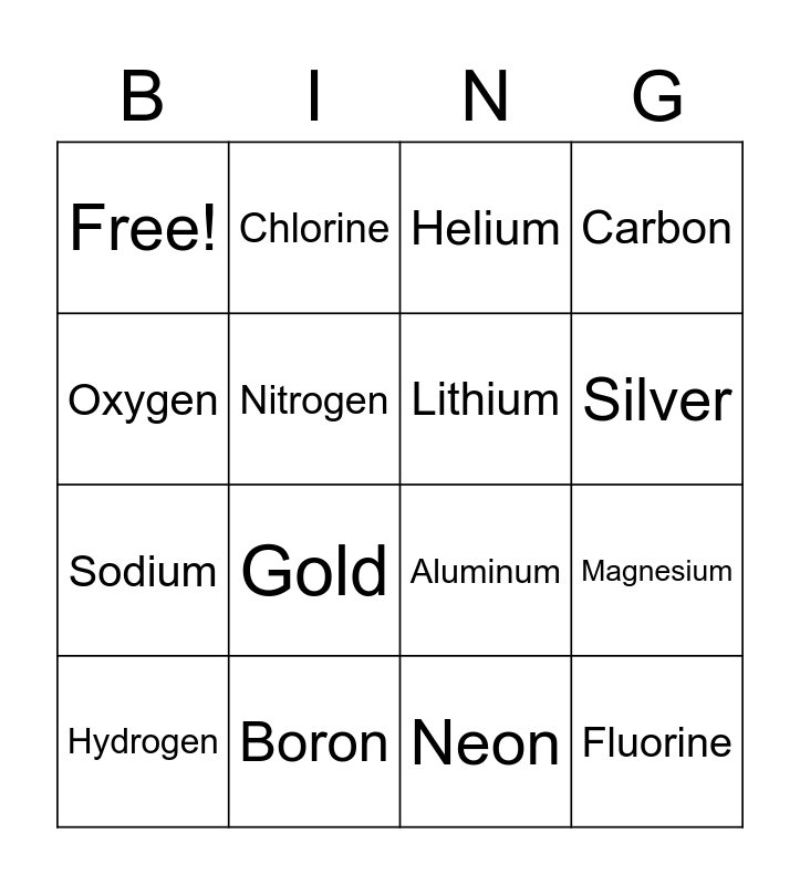This bingo card has 16 words: Hydrogen, Boron, Helium, Carbon, Oxygen, Chlorine, Aluminum, Magnesium, Free!, Nitrogen, Neon, Silver, Sodium, Gold, Lithium and Fluorine.