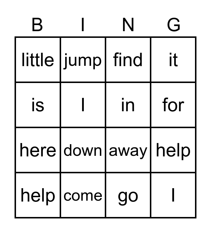 ⚠ This card has duplicate items: go (2), help (2), here (2), I (2), in (2), is (2), it (2), jump (2), little (2), blue (2), can (2), come (2), down (2)