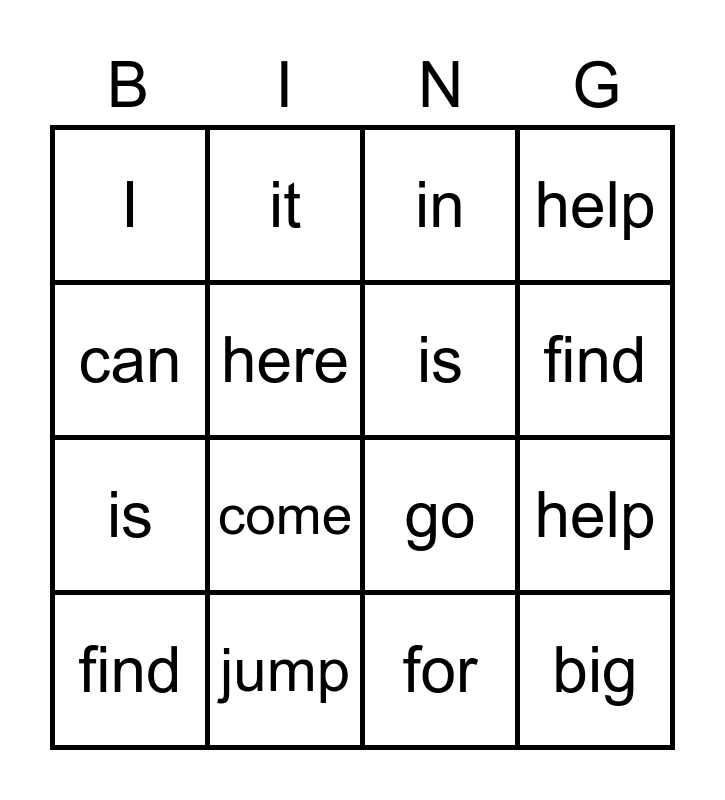 ⚠ This card has duplicate items: go (2), help (2), here (2), is (2), jump (2), little (2), find (2), blue (2), can (2), come (2)