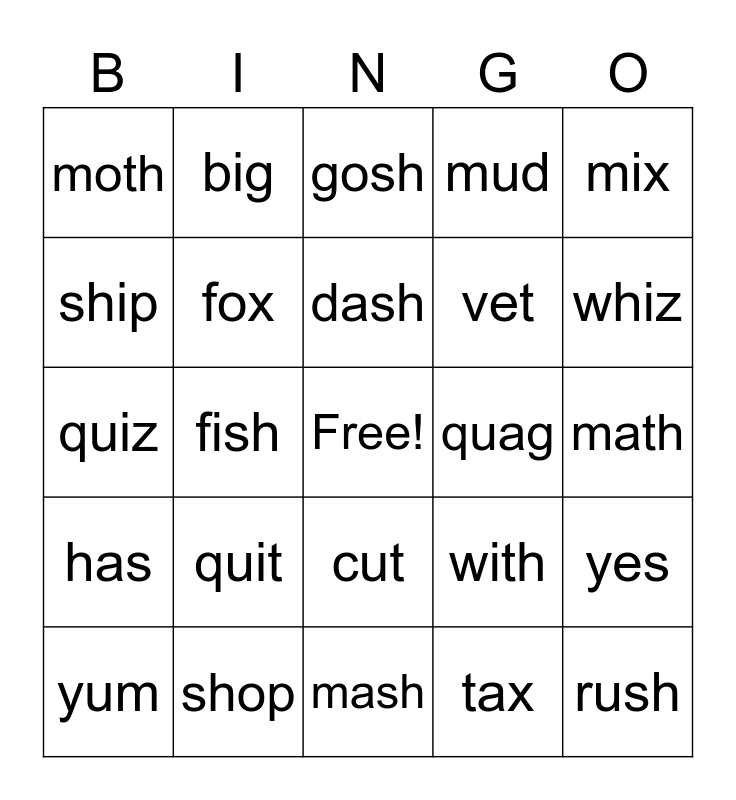 This bingo card has a free space and 24 words: quit, shop, dash, yum, mix, moth, ship, big, quag, cut, vet, quiz, with, yes, fox, tax, math, gosh, whiz, fish, rush, has, mud and mash.
