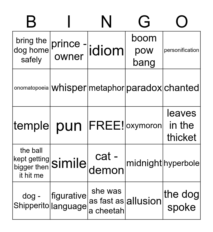 This bingo card has a free space and 24 words: simile, figurative language, metaphor, dog - Shipperito, personification, bring the dog home safely, onomatopoeia, prince - owner, oxymoron, cat -demon, paradox, temple, midnight, hyperbole, whisper, allusion, leaves in the thicket, idiom, chanted, pun, the dog spoke, the ball kept getting bigger then it hit me, boom pow bang and she was as fast as a cheetah.