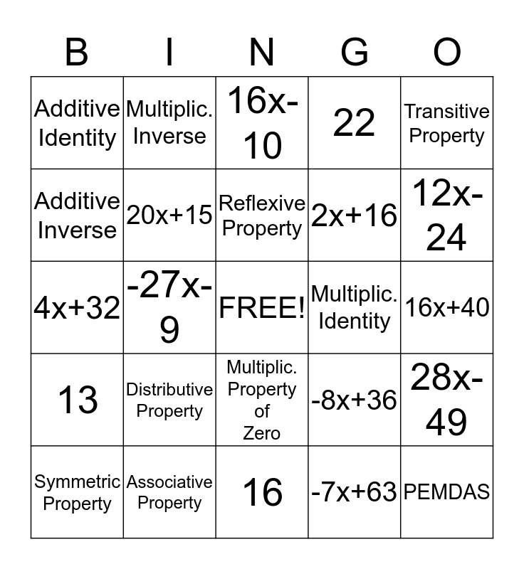 This bingo card has a free space and 24 words: Distributive Property, Associative Property, Reflexive Property, Symmetric Property, Transitive Property, Additive Identity, Additive Inverse, Multiplic. Inverse, Multiplic. Identity, Multiplic. Property of Zero, 2x+16, 4x+32, -8x+36, 28x-49, 20x+15, -7x+63, 16x+40, 16x-10, 12x-24, -27x-9, PEMDAS, 13, 22 and 16.