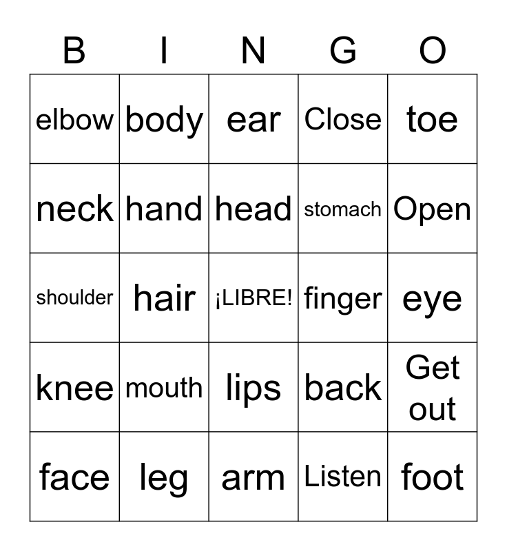 This bingo card has a free space and 25 words: mouth, arm, head, face, toe, elbow, neck, body, finger, lips, stomach, shoulder, back, Get out, hand, nose, eye, ear, Open, hair, foot, leg, knee, Close and Listen.