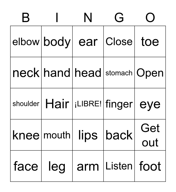 This bingo card has a free space and 25 words: mouth, arm, head, face, toe, elbow, neck, body, finger, lips, stomach, shoulder, back, Get out, hand, nose, eye, ear, Open, Hair, foot, leg, knee, Close and Listen.