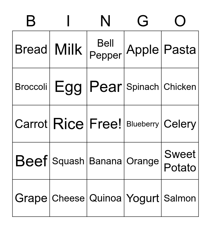 This bingo card has a free space and 24 words: Squash, Cheese, Pear, Grape, Pasta, Bread, Broccoli, Milk, Blueberry, Banana, Spinach, Carrot, Orange, Sweet Potato, Egg, Yogurt, Celery, Bell Pepper, Chicken, Rice, Salmon, Beef, Apple and Quinoa.