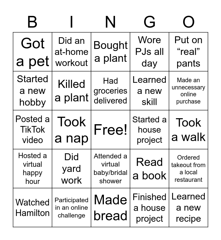 This bingo card has a free space and 31 words: Made bread, Tie-dyed something, Took a nap, Took an online class, Got a pet, Bought a plant, Killed a plant, Read a book, Started a house project, Finished a house project, Took a walk, Learned a new recipe, Studied for a test, Completed a puzzle, Made an unnecessary online purchase, Made something you saw on Pinterest, Ordered takeout from a local restaurant, Did yard work, Hosted a virtual happy hour, Attended a virtual baby/bridal shower, Put on “real” pants, Binge watched a series in a day, Watched Hamilton, Did an at-home workout, Learned a new skill, Started a new hobby, Wore PJs all day, Posted a TikTok video, Participated in an online challenge, Had groceries delivered and Gave someone a haircut (including yourself).