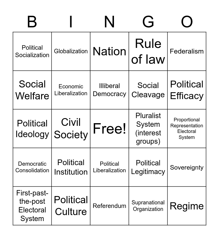 This bingo card has a free space and 33 words: Civil Liberties, Civil Service/ Bureaucracy, Civil Society, Corporatist System (interest groups), Democratic Consolidation, Economic Liberalization, Federalism, First-past-the-post Electoral System, Globalization, Government Transparency, Illiberal Democracy, Nation, Nationalized Industry, Neoliberalism, Pluralist System (interest groups), Political Efficacy, Political Culture, Political Ideology, Political Institution, Political Legitimacy, Political Liberalization, Political Rights, Political Socialization, Proportional Representation Electoral System, Referendum, Regime, Rule of law, Social Cleavage, Social Welfare, Sovereignty, State (polity), Supranational Organization and Unitary System.