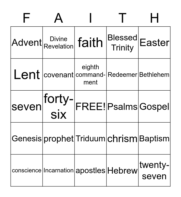 This bingo card has a free space and 24 words: prophet, Incarnation, eighth command- ment, conscience, Easter, Advent, Lent, Divine Revelation, Psalms, Triduum, Redeemer, seven, chrism, Baptism, covenant, Hebrew, Gospel, faith, Bethlehem, forty-six, twenty- seven, Genesis, Blessed Trinity and apostles.