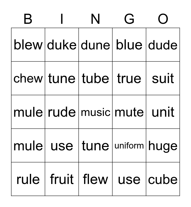 This bingo card has 32 words: use, cute, rude, rule, mule, tune, dude, huge, duke, cube, tube, dune, flute, fume, mute, plume, rule, mule, tune, use, uniform, unicorn, unit, fruit, music, blue, true, chew, blew, flew, tissue and suit.