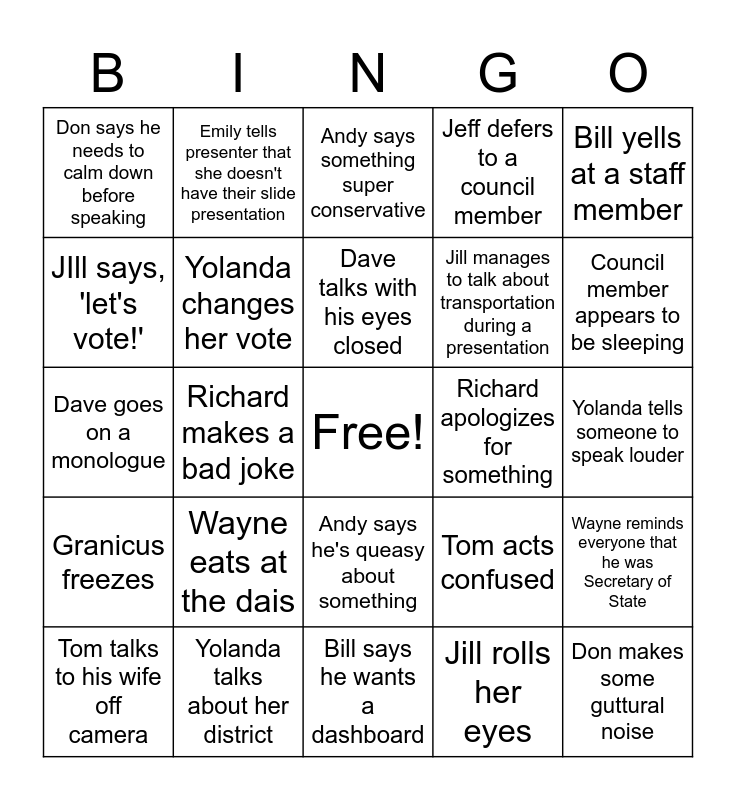 This bingo card has a free space and 24 words: Wayne eats at the dais, Yolanda talks about her district, Dave talks with his eyes closed, Tom talks to his wife off camera, Bill yells at a staff member, Don says he needs to calm down before speaking, JIll says, 'let's vote!', Emily tells presenter that she doesn't have their slide presentation, Richard apologizes for something, Andy says he's queasy about something, Jill manages to talk about transportation during a presentation, Dave goes on a monologue, Tom acts confused, Wayne reminds everyone that he was Secretary of State, Yolanda changes her vote, Jill rolls her eyes, Yolanda tells someone to speak louder, Andy says something super conservative, Council member appears to be sleeping, Richard makes a bad joke, Don makes some guttural noise, Granicus freezes, Jeff defers to a council member and Bill says he wants a dashboard.