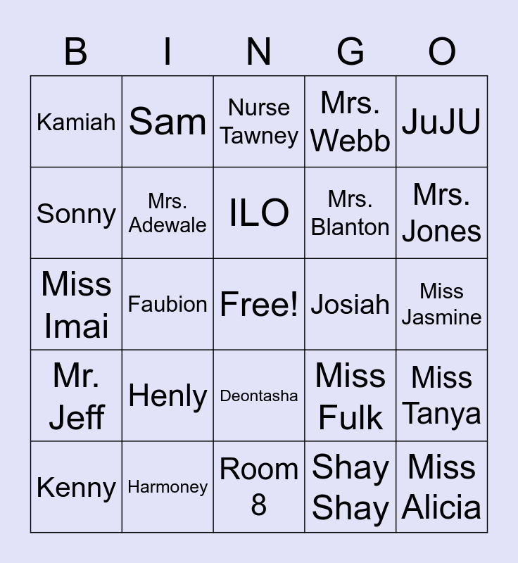 This bingo card has a free space and 24 words: Henly, Harmoney, ILO, Kenny, JuJU, Kamiah, Sonny, Sam, Josiah, Deontasha, Mrs. Blanton, Miss Imai, Miss Fulk, Miss Tanya, Mrs. Adewale, Shay Shay, Miss Jasmine, Nurse Tawney, Mrs. Jones, Faubion, Miss Alicia, Mr. Jeff, Mrs. Webb and Room 8.