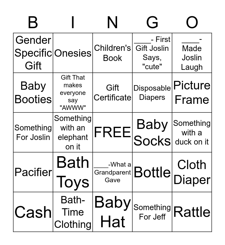 This bingo card has a free space and 27 words: Bottle, Baby Blanket, Disposable Diapers, Baby Hat, Baby Booties, Children's Book, Onesies, Pacifier, Baby Socks, Cloth Diaper, Something For Joslin, ____- First Gift Joslin Says, "cute", Cash, Bath-Time Clothing, Picture Frame, Baby Toy, Gift That makes everyone say "AWWW", Gift Certificate, Bath Toys, Gender Specific Gift, Something with a duck on it, Something For Jeff, Something with an elephant on it, Rattle, ____-What a Grandparent Gave, ____-Made Joslin Laugh and ____- Made Joslin cry.