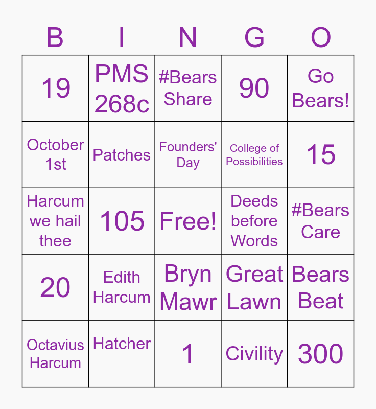 This bingo card has a free space and 24 words: Edith Harcum, Hatcher, Founders' Day, Octavius Harcum, Go Bears!, 19, October 1st, PMS 268c, Deeds before Words, Bryn Mawr, College of Possibilities, Harcum we hail thee, Great Lawn, Bears Beat, Patches, Civility, #Bears Care, #Bears Share, 15, 105, 300, 20, 90 and 1.