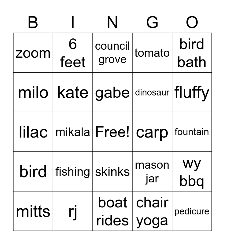 This bingo card has a free space and 24 words: mitts, fishing, gabe, chair yoga, bird bath, zoom, 6 feet, council grove, carp, fountain, lilac, kate, mason jar, wy bbq, milo, rj, boat rides, tomato, fluffy, bird, mikala, skinks, dinosaur and pedicure.